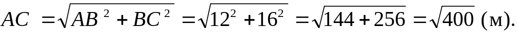 Пример 1. Найдем расстояние от вершины дерева до конца его тени, если высота дерева равна 12 м, а длина тени -- 16 м.