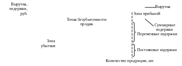 Треугольник, находящейся слева от точки пересечения линии выручки с линией суммарных издержек, представляет собой зону убытков.