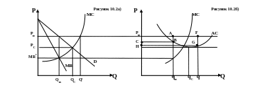 Предположим, что несколько производителей кирпичей желают образовать картель. Фирмы выпускают стандартизированную продукцию, потребители не видят особой разницы в том, у какой фирмы покупать кирпич. Фирмы устанавливают цены на уровне P=AC. Общий выпуск находится на конкурентном уровне Qc на рис.10.2а), соответствующем размеру выпуска, при котором кривая спроса пересекает кривую МС, являющуюся горизонтальной суммой кривых предельных издержек каждого продавца. Кривая MR была бы кривой спроса, если бы рынок был полностью конкурентным.