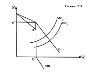 Максимальные прибыли соответствуют размеру выпуска, при котором MR=MC. Кривая предельных затрат МС1, следовательно, максимизирующий прибыль выпуск равен Q*, а цена равна Р*.