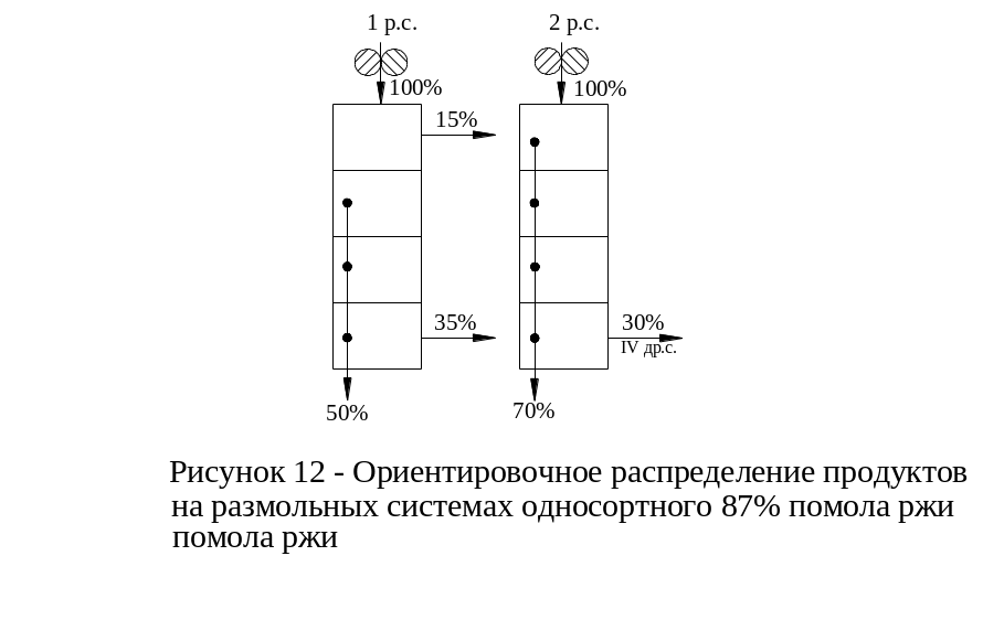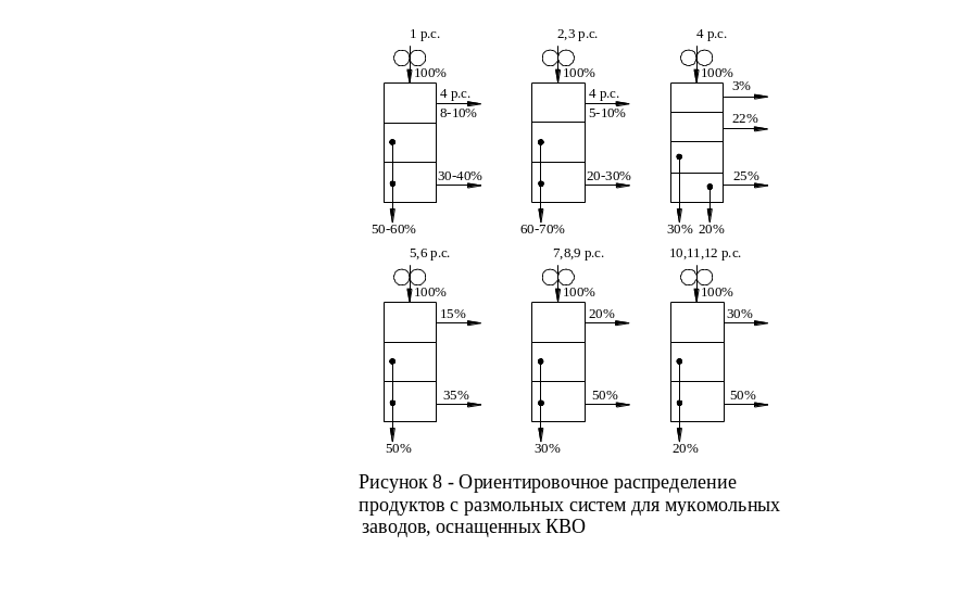 Рис.12 – Ориентировочное распределение продуктов на размольных системах односортного 87% помола ржи