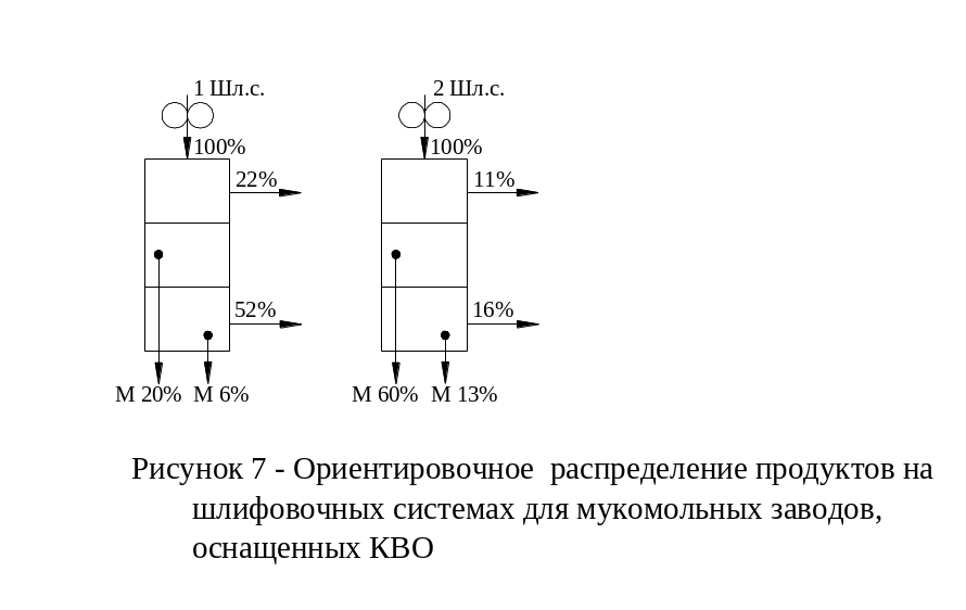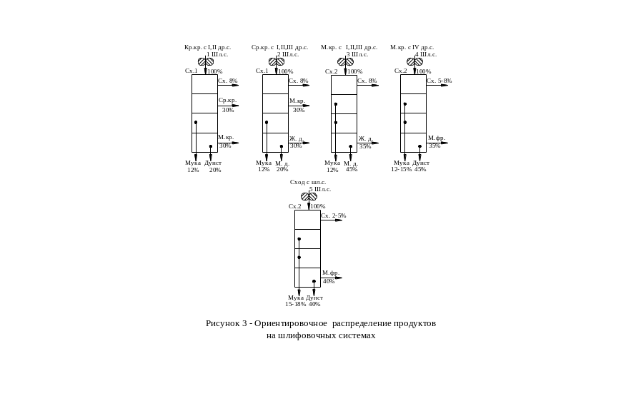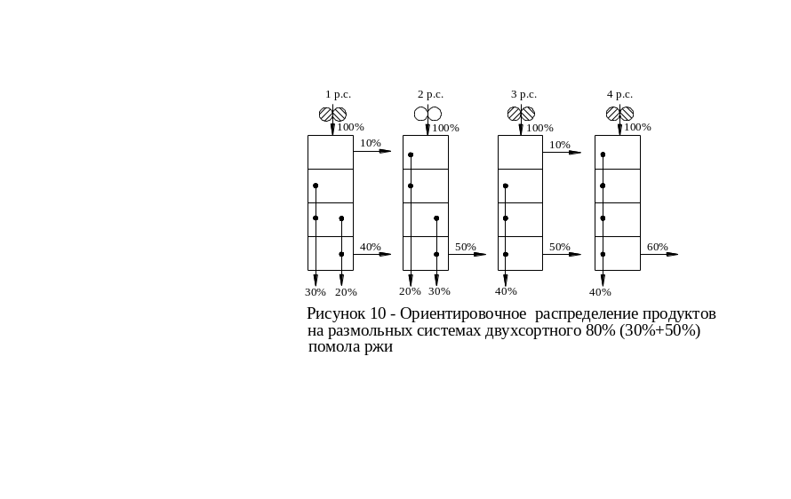 Рис.10 – Ориентировочное распределение продуктов на размольных системах двухсортного 80% (30+50) помола ржи