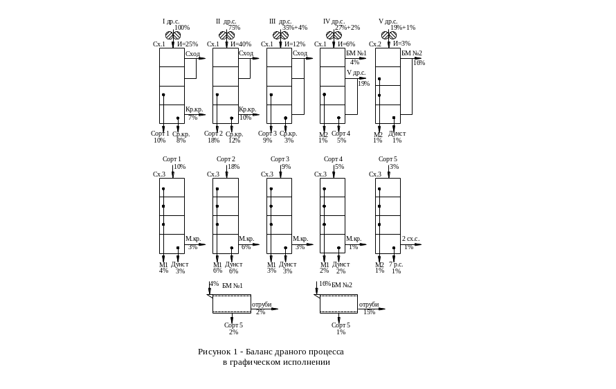 Для примера рассмотрим баланс драного процесса в графическом исполнении. С ситовеечных машин (рис.1) на III и IV драные системы поступают 4%. и 2 % условно сходовых продуктов. Из баланса следует, что на I драную систему поступило 100% зерна и на III, IV драные системы дополнительно 6% сходов с ситовеечных машин. Таким образом, всего на драные системы поступило 100+6=106%. В результате размола зерна в драном процессе получено крупных, средних и мелких крупок 17+23+13=53%; дунстов 15,0%, муки 18,0%, отрубей 18,0%. Кроме того, с сортировочной системы №5 направлено в размольный процесс 1% дунста на 2-ю сходовую 1% дунста на 7 размольную систему. Всего получено продуктов 53+15+18+18+1+1=106%.
