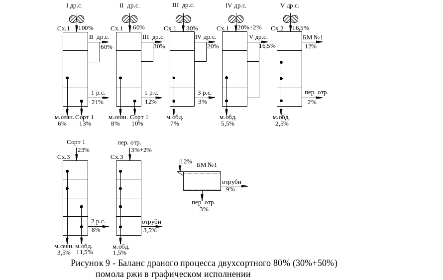 Рис.9 – Баланс драного процесса двухсортного 80% (30+50) помола ржи в графическом исполнении