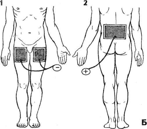 При гальванизации трусиковой зоны один электрод прямо угольной формы площадью 300 с м 2 помещают в пояснично- крестцовой зоне и соединяют с анодом. Два других электрода (площадью 150 см2 каждый) размещают на передней поверх ности верхней половины бедер и соединяют раздвоенным прово дом с катодом (рис. 10Б). Режимы тока и продолжительность процедур аналогичны предыдущей методике.