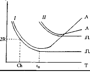 Рис. 17. Кривая "сила- длительность" (кривая I/T) для импульсов различной (П и / L ) формы в норме (I) и при патоло гии (II).