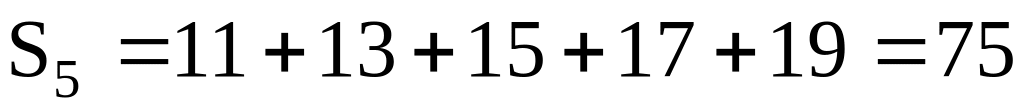 Задача. Частичная сумма первых пяти членов числового ряда 11; 13; 15; … , равна … . Варианты ответов: 1) 75 2) 19 3) 47,5 4) 80 Решение.