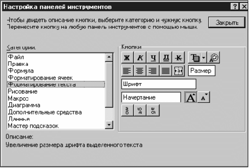 Убудовані панелі Microsoft Excel уже містять багатий набір кнопок інструментів. Є, одначе, безліч інших кнопок, невикористаних у початковій конфігурації вбудованих панелей, але які можна додати на панелі. Нарешті, ви можете створити власні кнопки інструментів і включити їх до загального списку. Для цього використовується діалогове вікно Настраивание (Вид/Панели инструментов.../Настраивание...).