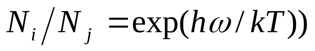 ► Равновесие между атомами и излучением. Пусть в объеме, заполненном равновесным излучением при температуре Т, находятся одинаковые атомы. Будем считать, что установилось тепловое равновесие между атомами и излучением, при этом среднее число атомов в состоянии I равно Ni а в состоянии j равно Nj. Эти числа при температуре Т связаны между собой соотношением Больцмана: