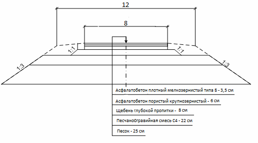 Для заданной конструкции дорожной одежды устанавливаем объемы работ и потребность в дорожно-строительных материалах. Для этого вычерчиваем точную конструкцию дорожной одежды. Заданная автомобильная дорога является дорогой III технической категории и имеет конструкцию дорожной одежды, представленную на рисунке 2.1.1.