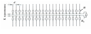 В качестве приемных антенн на КВ линиях получили широкое распространение антенны бегущей волны. Антенна бегущей волны (АБВ) представляет собой систему из параллельно расположенных симметричных вибраторов, подсоединенных к собирательной симметричной линии через элементы связи R (рис.9.1.).