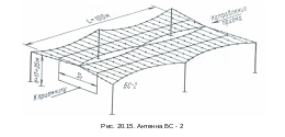 Для сужения главного лепестка ДН и увеличения КНД на линиях КВ-связи широко используются антенны бегущей волны, имеющие в своем составе два полотна антенны БС, соединенных параллельно с помощью экспотенциальных трансформаторов (рис.9.2.). Трансформаторами являются сами распределительные фидеры, состоящие из двух последовательно соединенных вертикального ТФ 168/208 и горизонтального ТФ = 208/416, что обеспечивает согласование антенны с основным фидером с волновым сопротивлением Wф = 208 Ом.