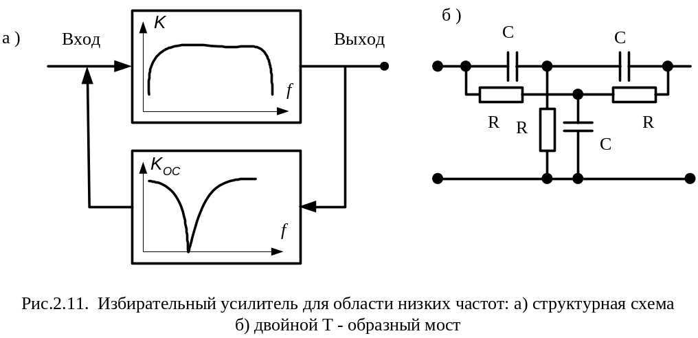 В цепи ООС НЧ избирательных усилителей часто используют двойной Т – образный мост, выполненный на RC элементах (рис.2.11, б). Эквивалентная добротность таких схем может достигать несколько десятков тысяч.