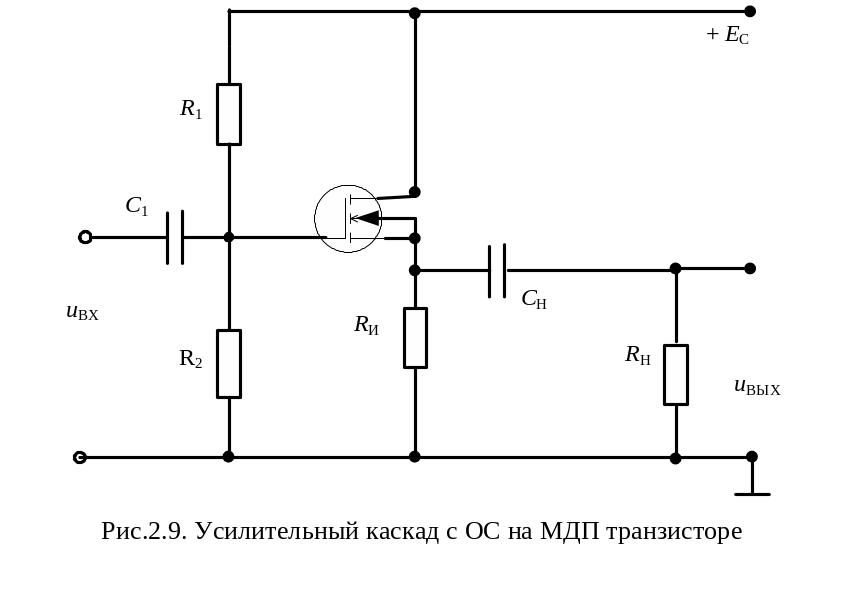 Делитель напряжения R1, R2 и разделительные конденсаторы С1, С2 выполняют те же функции, что и в каскаде усилителя с ОЭ. Резистор RИ выполняет функцию термостабилизации режима работы полевого транзистора по постоянному току. Для исключения ООС по переменному току резистор шунтируют конденсатором СИ.