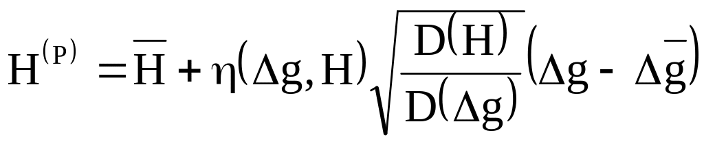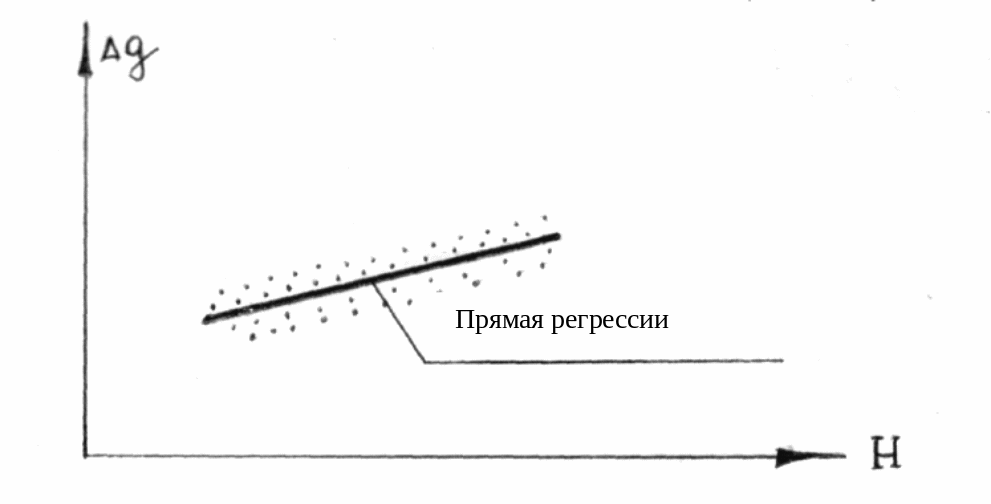 В общем случае связь между Δg и Η обычно бывает нелинейной, однако, всегда можно подобрать такой линейный закон, который бы наилучшим образом аппроксимировал наблюдаемую зависимость между Δg и Η. Решение этой задачи дает уравнение прямой средней квадратической регрессии величины Н по Δg, имеющее следующий вид: