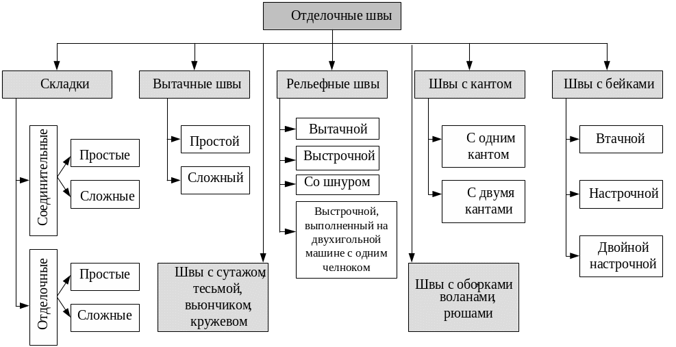К группе ОТДЕЛОЧНЫХ ШОВ (рисунок 2.14) относятся подгруппы по обработке складок, вытачных и рельефных швов, швов с кантом, бейками и др. [2].