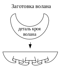 Обработку оборок (рисунок 2.23), рюш (рисунок 2.24), воланов (рисунок 2.25) начинают с соединения их частей стачными швами вразутюжку или расстрочными.