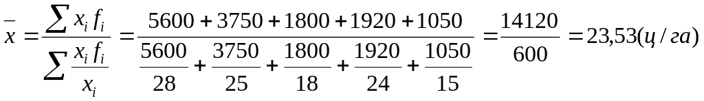 Из формулы видно, что средняя гармоническая – средняя взвешенная из варьирующих обратных значений признака. Она является преобразованной формой арифметической средней и тождественна ей. Вместо гармонической всегда можно рассчитать среднюю арифметическую, но для этого сначала нужно определить веса отдельных значений признака, скрытые в весах средней гармонической.