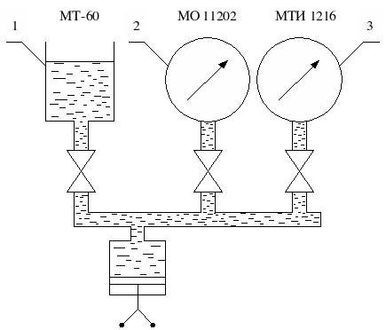 1 – грузопоршневой манометр МТ-60, 2 –образцовый манометр МО 11202, 3 – технический манометр МТИ 1216