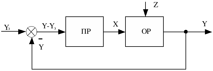 Простейшая система двухпозиционного регулирования может быть представлена в виде последовательного соединения позиционного регулятора (ПР) и объекта регулирования (ОР), охваченных отрицательной обратной связью (рисунок 8.1). Основным возмущающим воздействием здесь является нагрузка объекта Z, изменение которой компенсируется регулирующим воздействием X. Выходная величина двухпозиционного регулятора X может принимать только два значения, соответствующие максимальному (Хmax) и минимальному (Хmin) регулирующему воздействию на объект.