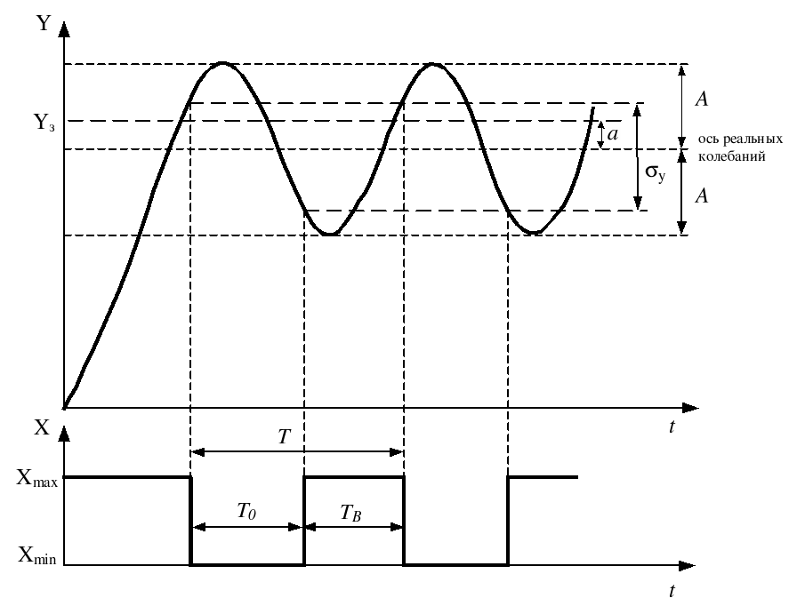 При Y<Yз идеальный позиционный регулятор вырабатывает регулирующее воздействия Х=Хmax, вызывающее изменение выходной величины Y(рисунок 8.3). При достижении Y величины Yз регулятор должен был бы сработать, однако ввиду наличия зоны нечувствительности y, изменение регулирующего воздействия от Хmах до Хmin происходит с некоторым запаздыванием, при Y>Yз. Таким образом, при использовании двухпозиционных регуляторов величина Y совершает колебания относительно заданного значения Yз. Такие колебания относительно среднего значения с амплитудой А и периодом Т называются автоколебаниями. Период автоколебаний равен