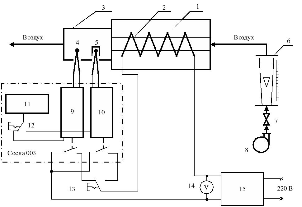 В лабораторной работе объектом регулирования является электрическая печь 1, оснащенная рабочей камерой 3 (рисунок 8.5). Автоматическая система двухпозиционного регулирования температуры в рабочей камере 3 выполнена на базе микропроцессорного измерителя−регулятора Сосна 003. Воздух, нагнетаемый вентилятором 8, поступает через кран 7 и ротаметр 6 в печь 1 и далее в камеру 3. Для измерения температуры в камере 3 установлены две термопары 4 и 5, причем термопара 5 помещена в металлический чехол. Расход воздуха (нагрузка объекта) контролируется по ротаметру 6 и изменяется с помощью крана 7. Термопары 4 и 5 подключены к измерителю-регулятору Сосна 003. Этот прибор включает в себя два канала 9, 10 для измерения и регулирования температуры и цифровое табло 11 для индикации. Подключение измерительных каналов к табло производится сенсорным переключателем 12, установленным на передней панели прибора. Подключение нагревательного элемента 2 электрической печи 1 к каналам 9, 10 измерителя-регулятора производится посредством переключателя 13. Таким образом, если нагревательный элемент печи подключен к каналу 9, то регулирование температуры печи будет производиться в зависимости от сигнала с термопары 4, а если нагревательный элемент печи подключен к каналу 10, то регулирование температуры печи будет производиться в зависимости от сигнала с термопары 5, помещенной в чехол. Это позволяет изменять ёмкость объекта регулирования. Напряжение питания печи (величина управляющего воздействия) устанавливается по вольтметру 14 лабораторным автотрансформатором 15.