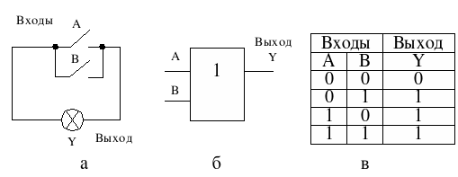 Рисунок 9.3 – Схема на переключателях (а), графическое обозначение (б) и таблица истинности (в) логического элемента «ИЛИ»