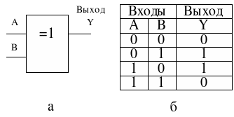 Рисунок 9.5 – Графическое обозначение (а) и таблица истинности (б) логического элемента «исключающее ИЛИ»