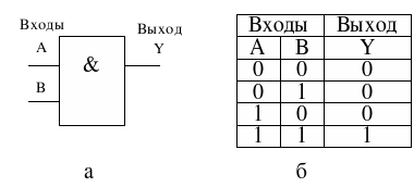 Рисунок 9.2 – Графическое обозначение (а) и таблица истинности (б) логического элемента «И»