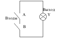 Основными составными частями любых цифровых устройств, включая современные ЭВМ, являются логические элементы. Логический элемент – это такая схема, которая, «основываясь» на входных сигналах, «может решать», что ей ответить на выходе – «да» или «нет». На рисунке 9.1 представлена схема логического элемента «И», которая отвечает «да» (на выходе загорается лампа) только в том случае, когда на оба ее входа поданы сигналы «да» (оба ключа замкнуты). Условное обозначение элемента «И» представлено на рисунке 9.2а.