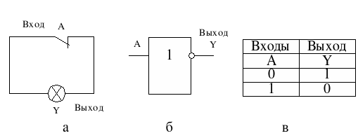 Рисунок 9.4 – Схема на переключателях (а), графическое обозначение (б) и таблица истинности (в) логического элемента «НЕ»