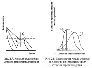 С увеличением скорости охлаждения кристаллизация протекает при более низкой температуре. Скрытая теплота бурно выделяется в начальный момент кристаллизации, температура резко повышается (кривая 2). Число зародышей увеличивается, из них вырастает много мелких кристаллов. Скорость увеличения линейных размеров кристалла (скорость кристаллизации) имеет размерность мм∙с-1. При большой степени переохлаждения (кривая 3) число центров кристаллизации и скорость роста кристаллов равны нулю и образуется аморфная структура – металлическое стекло.