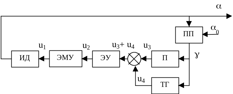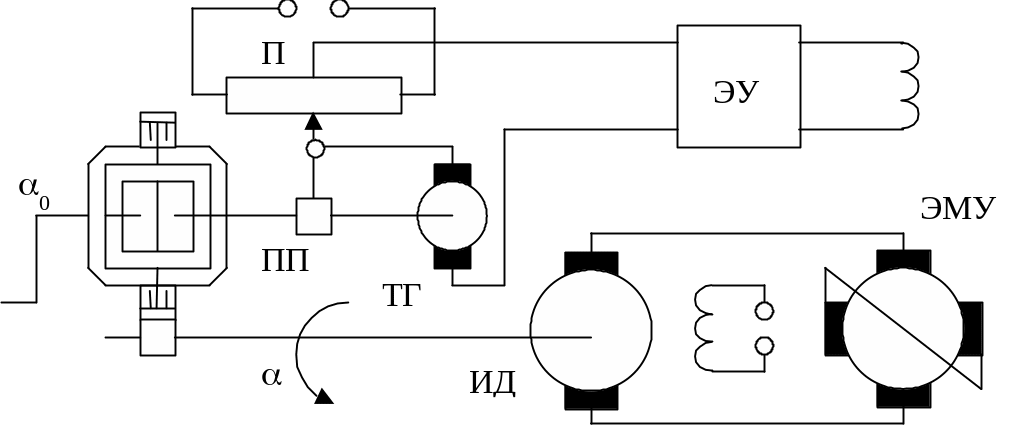 Объектом регулирования является исполнительный двигатель, регулируемой величиной – угол поворота ЭД, постоянное значение которой должно поддерживаться. Сравнивающее устройство заключено в приводе движка потенциометра, которое при изменении задающего значения угла поворота ЭД выдаёт сигнал рассогласования – разность между заданным и действительным значениями угла поворота ЭД. Сигнал рассогласования, преобразованный П и ТГ, поступает на ЭУ, затем ЭМУ и ИД. Таким образом, система будет находиться в равновесном состоянии при равных действительном и заданном значении, в противном случае – система стабилизации угла поворота изменит действительное значение угла поворота ЭД, пока тот не станет равен заданному.