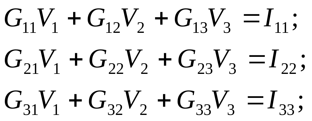 (позначка елемента рівняння складає № вузла контуру до якого підходить елементи провідності. Якщо цифри однакові загальна сума провідності – позитивна, а якщо ні, сума провідності – негативна);