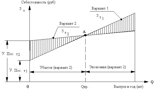 Точка пересечения этих линий А определяет критическое количество деталей Qкр, при котором оба варианта будут равноценными, то есть