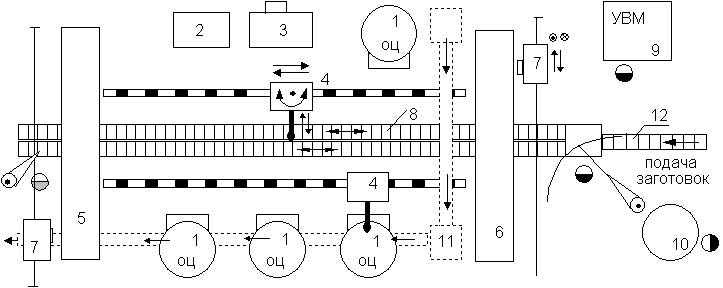 Заготовки с обработанными базовыми (технологическими) поверхностями поступают по транспортеру 12 на шариковый стол, где с помощью ручного манипулятора устанавливаются на специальные приспособления — "спутники" (палеты). На каждую заготовку приклеивается магнитный информационный носитель, в котором содержится информация о заготовке (номер, материал и т.д.). По команде оператора робот-штабелер устанавливает "спутник" с закрепленной на нем заготовкой в любую свободную ячейку склада заготовок. Считывающее устройство ячейки передает информацию на УВМ участка.