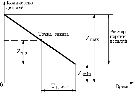 Сущность системы в том, что ПДО предприятия держит под контролем наличие деталей на промежуточных складах. Запасы деталей поддерживаются на уровне, обеспечивающем бесперебойное снабжение сборочных цехов. Если запас падает до заданной "точки заказа", ПДО выдает цеху заказ на изготовление партии деталей. Уровень запаса деталей каждого наименования на складе, соответствующий "точке заказа" Zт.з определяется по формуле