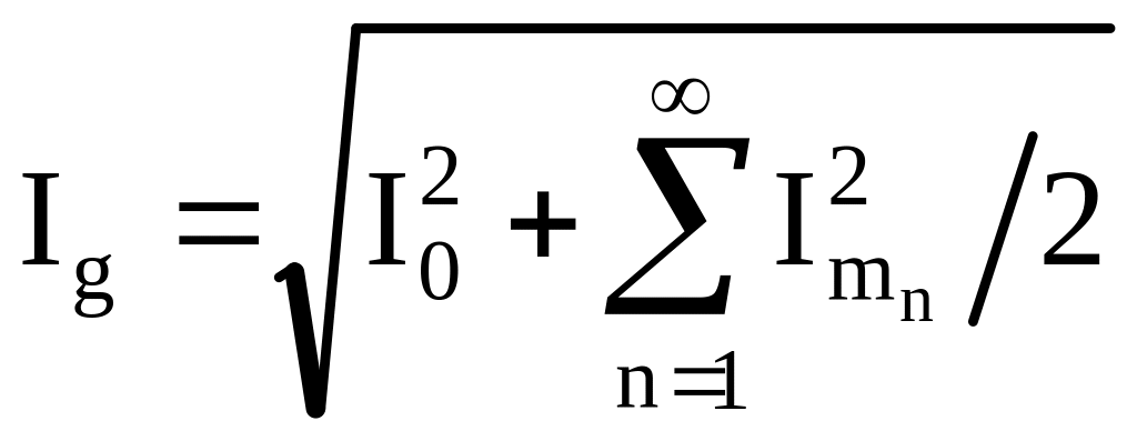 Таким образом, действующее значение периодического несинусоидального тока равно корню квадратному из суммы квадратов действующих значений гармоник, включая постоянную составляющую. Активная мощность периодического несинусоидальго тока также может быть рассчитана с использованием разложения в ряд Фурье. Известно, что активная мощность равна среднему значению мощности за период