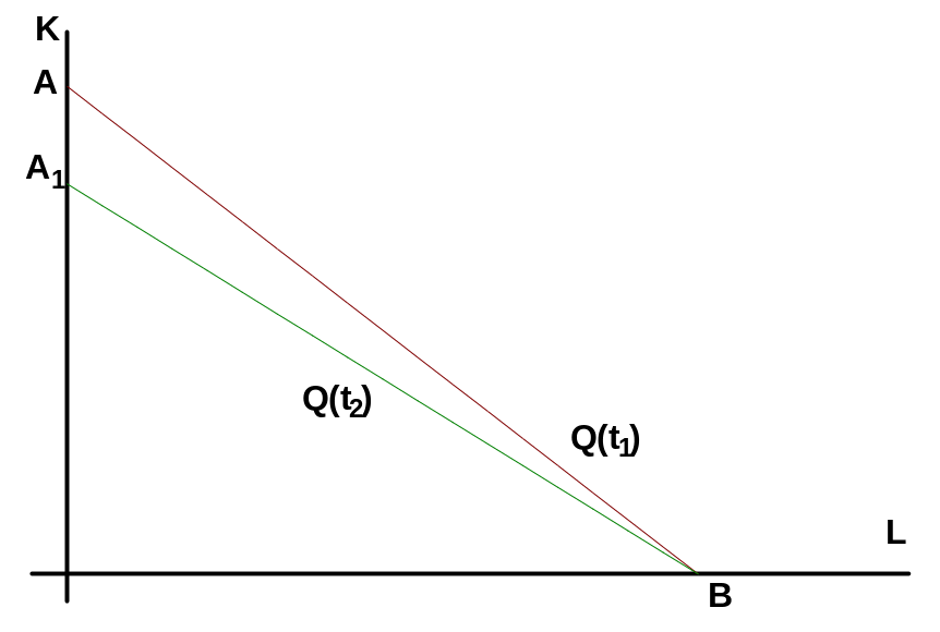 где a(t) – возрастающая функция t. Это означает, что с течением времени изокванта Q (отрезок прямой АВ) смещается к началу координат параллельным переносом (рис. 6.14) в положение A1B1.