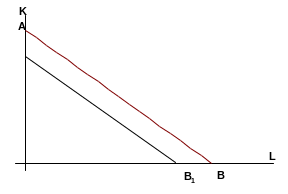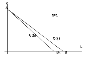 Очевидно, что с течением времени точка А остается на месте и изокванта смещается к началу координат при помощи поворота в положение AB1(рис. 6.15).