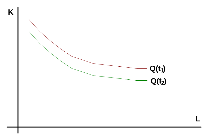 которое и отражает факт роста производства во времени при фиксированных затратах труда и капитала. Геометрическая иллюстрация такого процесса дана на рис.6.13, где показано, что изокванта, соответствующая выпуску продукции в объеме Q, смещается с течением времени (t2>t1) вниз и налево.