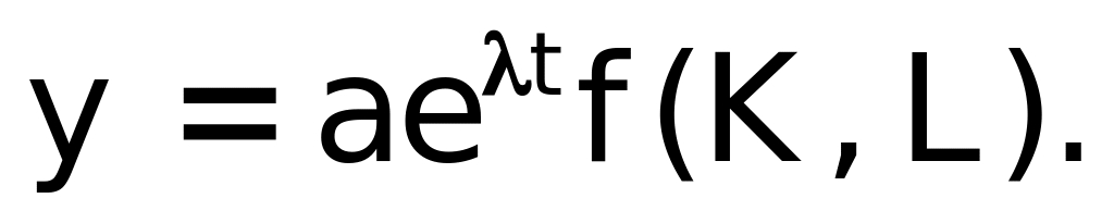 а) представление об экзогенном (или автономном) техническом прогрессе, который существует также в том случае, когда основные производственные факторы не изменяются. Частным случаем такого НТП является нейтральный прогресс по Хиксу, который обычно учитывается с помощью экспоненциального множителя, например: