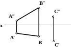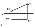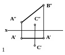1. Поскольку прямая AB параллельна горизонтальной плоскости проекций - это видно из того, что ее фронтальная проекция A″B″ параллельна оси x – то угол между прямой AB и перпендикуляром CD, опущенным на нее из точки C, проецируется на плоскость H без искажения, т. е. как прямой.