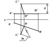 2. Так как сам отрезок CD не параллелен ни одной из плоскостей проекций, необходимо определить его действительную величину любым доступным способом, например способом прямоугольного треугольника.