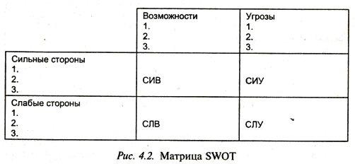 Для определения маркетинговых возможностей используется метод, получивший название SWOT-анализа (аббревиатура составлена из первых букв английских слов strength, weaknesses, opportunities, threats – сила, слабости, возможности и угрозы). Данный метод заключается в анализе сильных и слабых сторон организации, возможностей и угроз.
