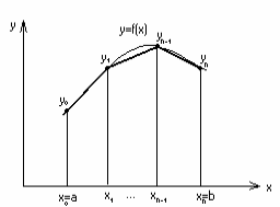 Дуга криво¿ f(x) зам³няºться стягуючою ¿¿ хордою. В точках розбиття проведемо ординати до перетину з кривою y=f(x). К³нц³ ординат з’ºднаºмо прямол³н³йними в³др³зками. Тод³ можна зам³нити кожну з одержаних кривол³н³йних трапец³й прямол³н³йною (рис.4). Площа кривол³н³йно¿ трапец³¿ ay0ynb можна вважати наближено дор³внюº сум³ площ прямол³н³йних трапец³й.