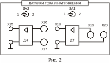 Датчики тока (ДТ) и напряжения (ДН) (рис. 2) предназначены для безопасного измерения и осциллографирования сигналов по напряжению и току при исследовании исследуемых модулей. На гнезда Х16 и Х17 подаются измеряемые сигналы по напряжению, а на гнезда Х19 и Х20 – токовые. К верхним гнездам (Х16 и Х19) датчиков следует подключать сигналы с положительной полярностью, а к нижним гнездам (Х17 и Х20) – сигналы с отрицательной полярностью. Выходные сигналы, подключаемые к каналам ввода А1 – А4 (см. рис. 1) или к осциллографу, снимаются с гнезд Х15, Х18 и общего провода «».