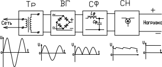 Вентильная группа ВГ осуществляет непосредственное выпрямление переменного тока, сглаживающий фильтр СФ уменьшает пульсацию выпрямленного напряжения, а стабилизатор напряжения СН поддерживает величину этого напряжения неизменной, независимо от тока нагрузки.