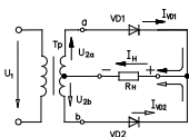 Напряжение и ток сохраняют свое направление на нагрузке в течение всего периода. Закрашенными стрелками на схеме указано направление тока для положительного полупериода, незакрашенными – для отрицательного.