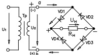 Мостовой выпрямитель состоит из трансформатора и четырех диодов, подключенных к вторичной обмотке трансформатора по мостовой схеме, где нагрузка RН включена в диагональ моста. Каждая пара диодов VD1,VD3 и VD2, VD4 работает попеременно в зависимости от знака напряжения на вторичной обмотке U2 в тот или иной полупериод переменного напряжения.